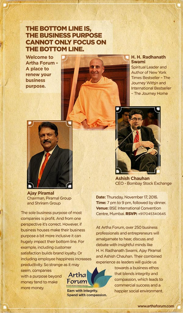 Artha Forum hosted business leaders at the Bombay Stock Exchange, Mumbai to discuss why business purpose must go beyond profit, featuring Radhanath Swami, Ajay Piramal, and Ashish Chauhan.
